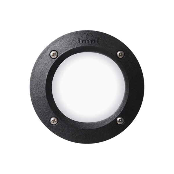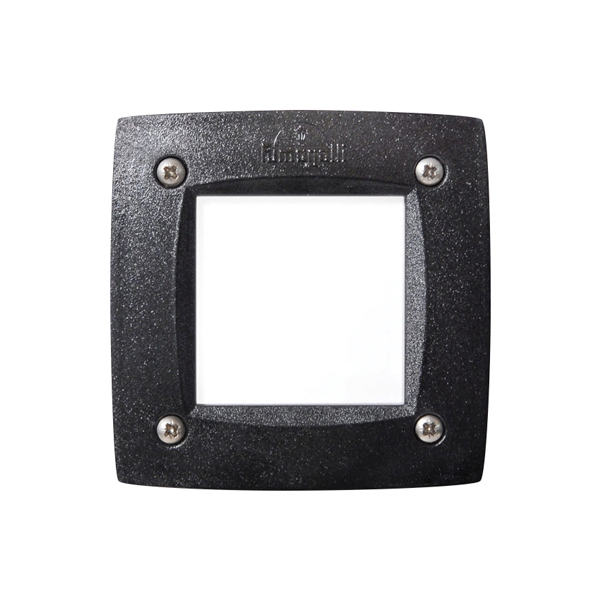 Discreta luminaria para empotrar a muro en exterior, fabricada en tecnopolímeros en Italia.